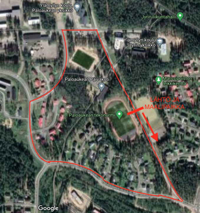 - Lähtö ja maalipaikka Paloaukean jalkapallo ja pesiskentän välissä. Reitti piirrettyy ao. kuvaan.